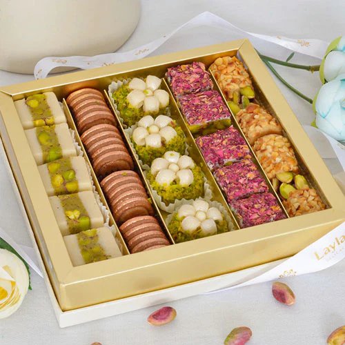 This luxurious assortment features our premium baklava, ma'amoul with various fillings, ghraybeh (shortbread cookies), and assorted Arabic sweets. Beautifully packaged in our signature gift boxes, perfect for sharing with family and friends.